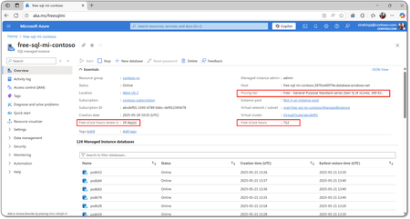 Version 1.0If only this free offer would be working. Tried multiple times and always got "Free SQL Managed Instance is not enabled for this subscription." error during deployment despite the fact that I applied that free offer. And there is no way to create any kind of support ticket... frustrating.