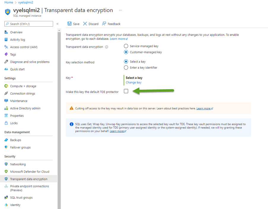 After choosing Select and then Save options on the next screen, within a few seconds our key is now enabled as the TDE protector for our SQL Managed Instance.