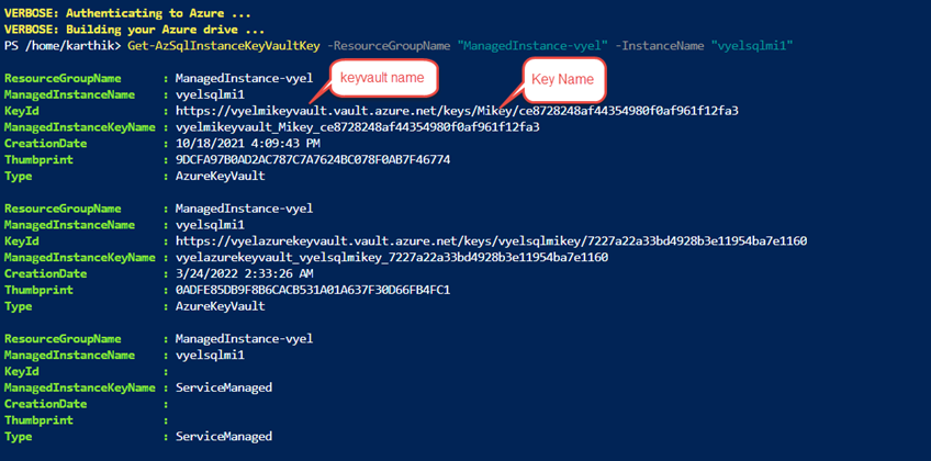 List of available keys on the Managed Instance