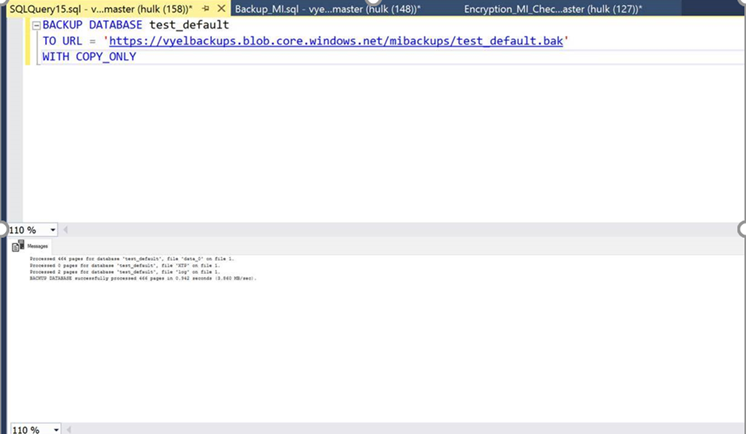 Following the above described process we have created a backup of a database on [vyelsqlmi1] to the Azure Blob Storage container- mibackups as shown below: