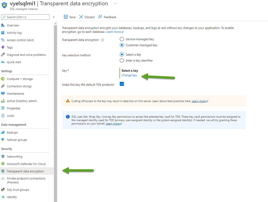We then selected Change key option and picked our Azure Key Vault (vyelazurekeyvault) and the respective key (vyelsqlmikey) as shown on the image below: