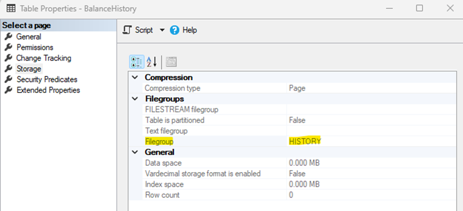 When you check the properties of the history table afterwards, you should see that the History filegroup is used.