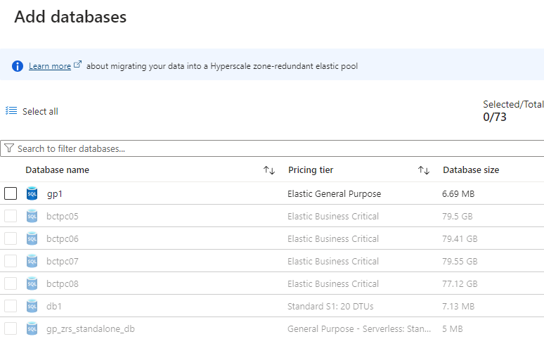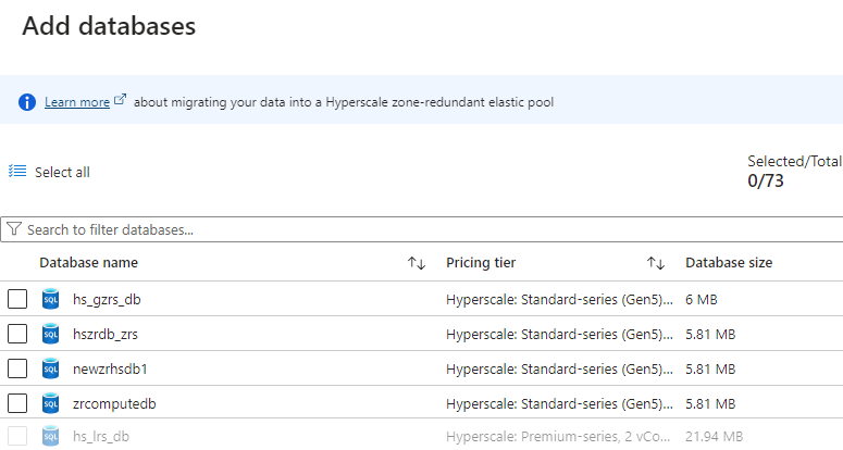 You can use the Azure portal to add non-Hyperscale databases to a zone redundant Hyperscale elastic pool. Databases can be added as long as a non-Hyperscale database has zone redundant storage (ZRS) and is also zone redundant. Any other non-Hyperscale databases cannot be selected on the Add databases pane in the portal:
