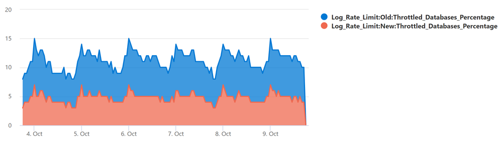 The chart below plots the percentage of General Purpose databases that reached log rate limit and experienced log rate throttling (defined as at least one LOG_RATE_GOVERNOR wait in a 1-hour interval). The higher (light blue) area is for databases with the old limits, and the lower (red orange) area is for databases with the new limits.