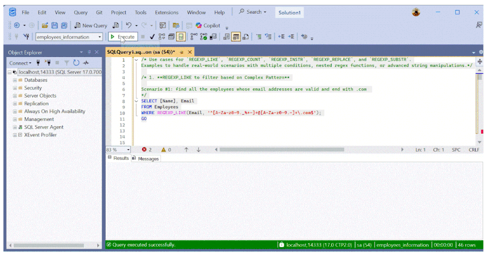 I tried out the new SQL Server Management Studio and had some fun testing few REGEX functions: