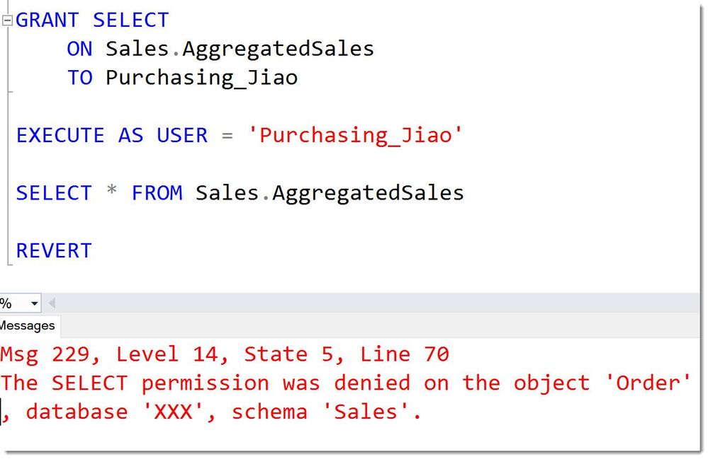 There is another way one can implement privilege separation in SQL Server and Azure SQL: normally, when multiple objects are accessed within one query, the SQL Server engine honors the so-called “ownership-chain”. This is a concept unique to SQL Server and has the effect that so long as any referenced object within a query is owned by the same principal as the first one in the chain, no further permission checks occur. This means a single SELECT (or INSERT-, UPDATE-, DELETE) -permission is required to access, for example, a View “AggregatedSales” if that view accesses a table “Orders” and the view and the table have the same owner. It is not required to grant SELECT on the table if the intention is to solely grant access to the accumulated data from the view. This is a built-in behavior.