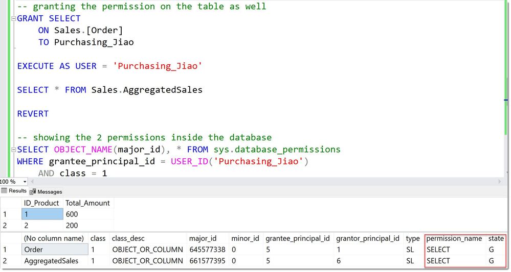 Hence the SELECT-permission on the view alone is not sufficient for User Jiao to query it, as is accesses the table.
