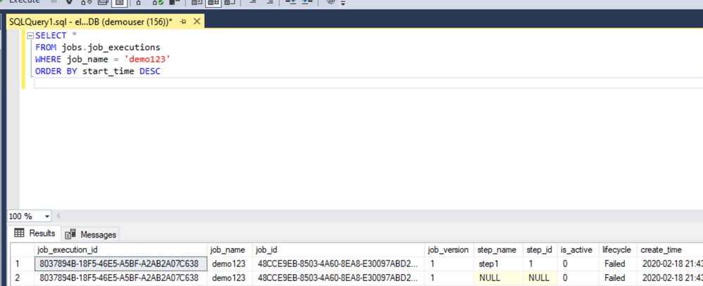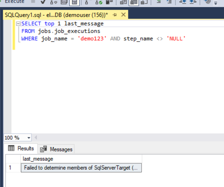 We can confirm the failure by issuing the following query in Sql Server Management Studio when connected to the job database (this hosts my Elastic Jobs agent) directly: