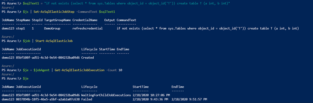 Recall that we expected this, since we knew there was a typo in the T-SQL used to define the step. I am going to update the T-SQL with the correct parenthesis. There are two ways to update a job step when you want to make this kind of a change - T-SQL or PowerShell. If you are using T-SQL, you will want to use the stored procedure jobs.sp_update_jobstep . In PowerShell you will use the Set-AzSqlElasticJobStep command from the specific job step you want to change. I am going to update my job step using PowerShell. To do this, first we need to bind the correct T-SQL text, then bind the specific job step we want to change, and then update it: