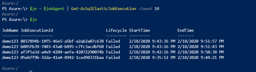 I run the job several times, but it fails. We can see this in the portal, or through Azure Cloud Shell: