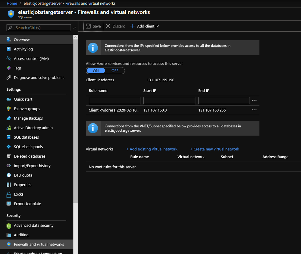 This error means that the Elastic Job Agent cannot connect to the target server(s) because the target has some firewall rules blocking the connection requests. Indeed - it is required that every target in the target group allows connections from Azure Services in order for Elastic Jobs to work. To fix this, I go to the target server in the Azure Portal and click on the “Firewalls and virtual networks” item under “Security”. Next, I toggle the "Allow Azure services" from OFF to ON, and save my changes.