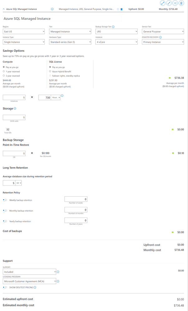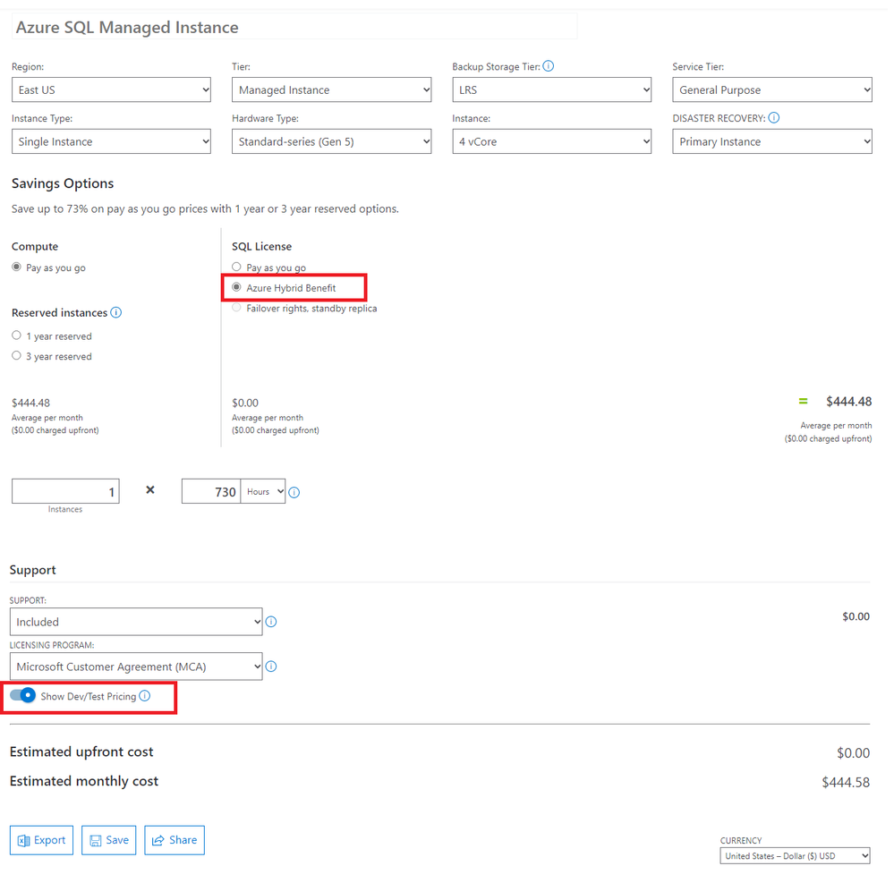 With one or another option leveraged, your SQL Managed Instance costs are reduced from ~740 to ~445$. Still quite expensive, but much better than from the start. Here is the screenshot of Azure Calculator for SQL Managed Instance with dev/test pricing applied. You can also see the option for applying Azure Hybrid Benefit.