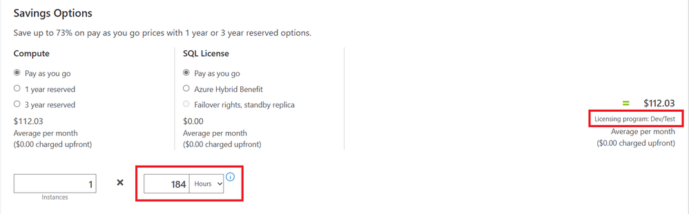 Now let’s do the simple math: 23 days x 8 working hours represents 184 working hours. If we apply that value in the cost calculator, we can see that compute costs are reduced to ~112$.