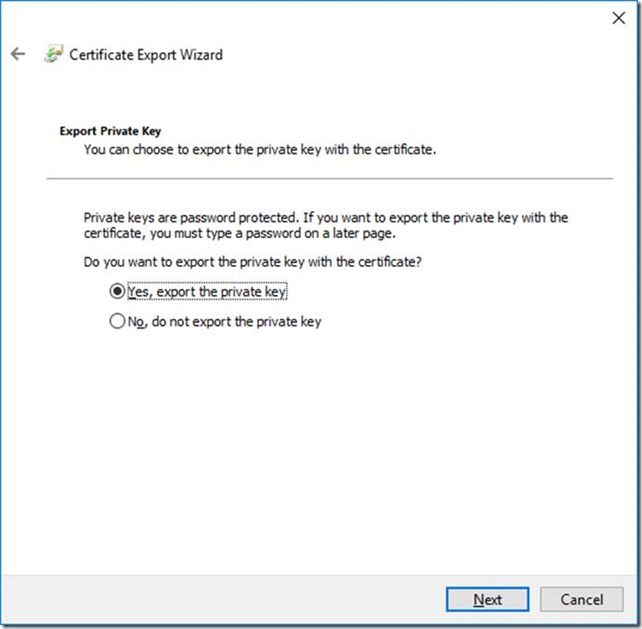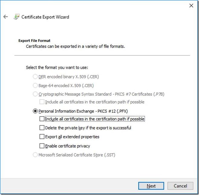 Protect it with a secure password, and save it as a .PFX file on your local computer.