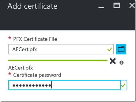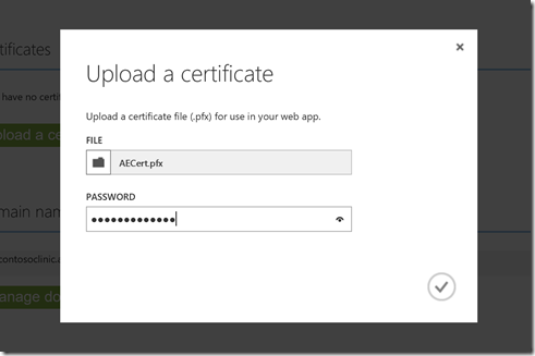 FYI, you can also do this in the ‘classic’ Azure portal as described here . Once in the Azure portal, select the web application and click on the Configure tab. There, you will find the Certificates section, where you can upload the PFX file which we just generated. Here too you have to supply the password which was used to protect the certificate:
