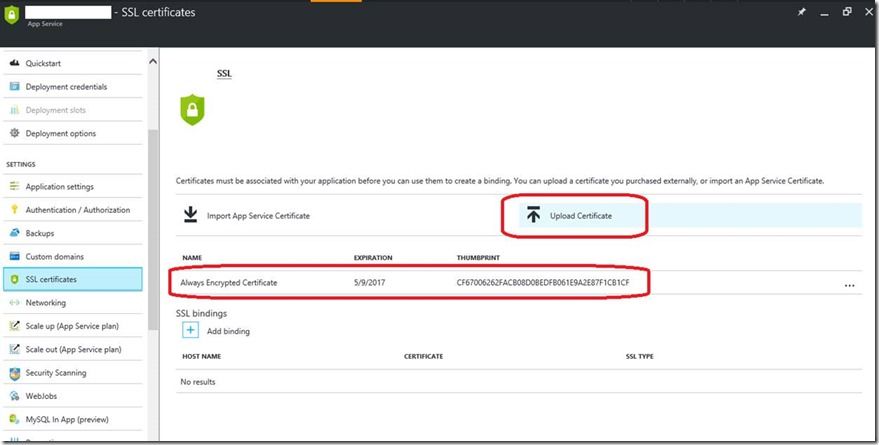 The easiest way is to use the current Azure Portal and navigate to the Web App under your App Service. Once you locate it, in the Application Settings for the Web App, you will find an option to define ‘SSL Certificates’ for the application. Here is where you can use the Upload Certificate button as shown below to upload the PFX file that we generated previously. Do note that you will have to supply the password used to protect the certificate: