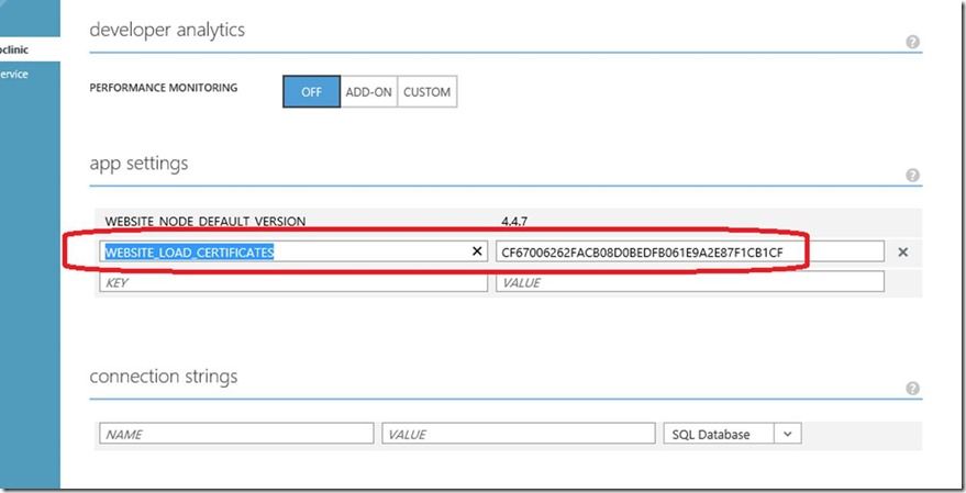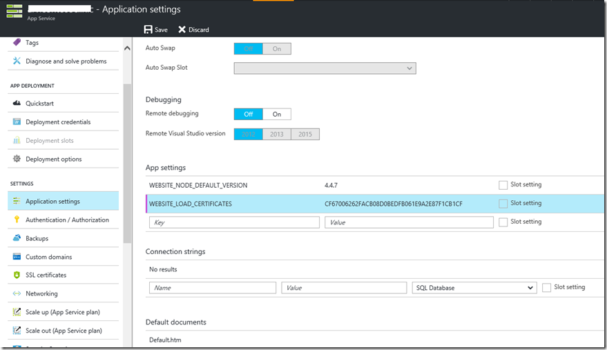 Once this is done, you also need to add a ‘WEBSITE_LOAD_CERTIFICATES’ setting with the thumbprint of the certificate that you noted previously. This setting is discussed in detail here .