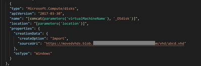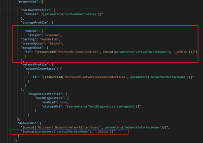 The ARM template used to create the VM (in this case found in the “Standardized_ARM_Templates\Custom_ARM_Templates\virtualMachines_VM1_ARM_Template_RG-POC1.json” file) will use an image available in the Azure stack Marketplace (in this case would be a new Windows Server 2019 server). To change this template, we’ll need to remove the parts that refer to this marketplace item: