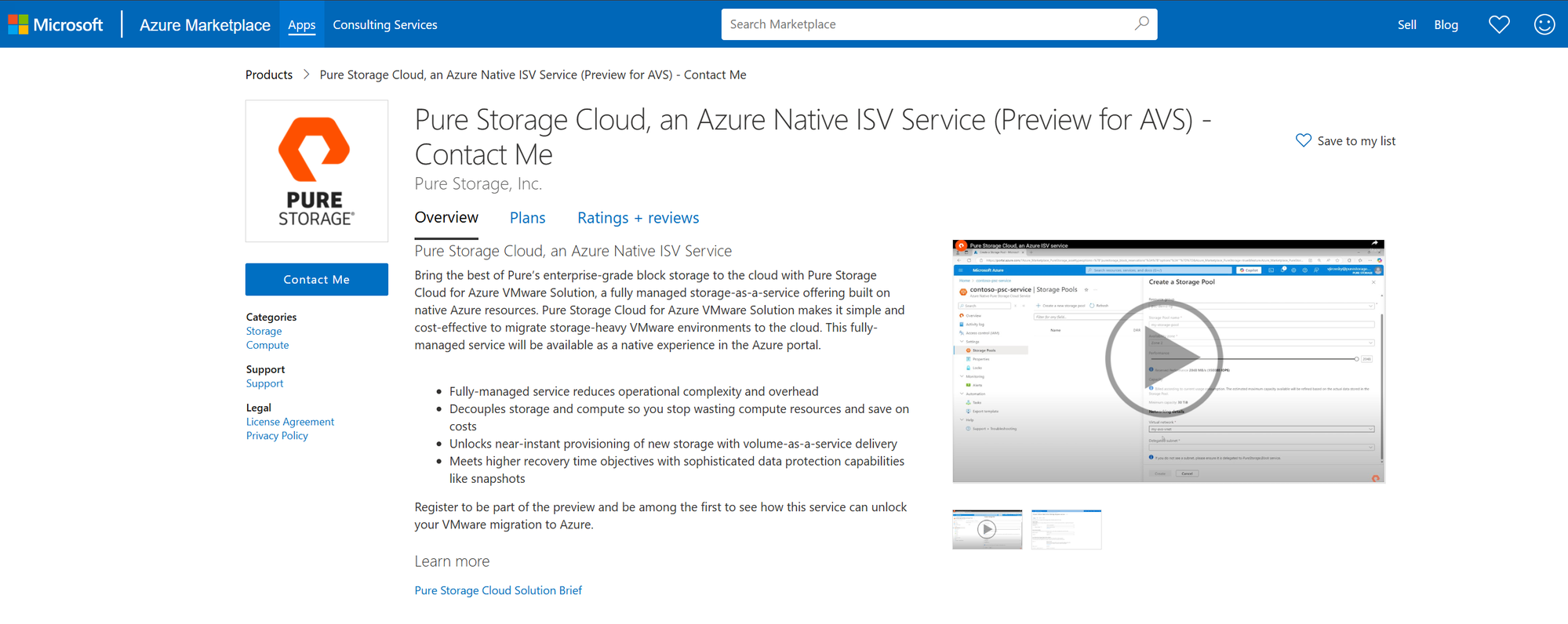 The Public Preview requires signup via the “Contact Me” link and you can get more information by contacting azurenative@purestorage.com. During Public Preview, please contact Pure Storage at support@purestorage.com should any issues arise. Pure Storage will then coordinate with Microsoft to resolve the issue. However, if the issue directly impacts your AVS SDDC outside of the storage layer, please open a support ticket through the Azure portal as you normally would. Note that during the public preview phase, running production workloads is not supported.