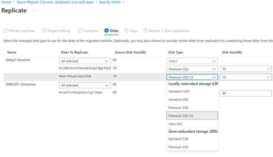 When Premium SSD v2 or Ultra disks are identified as the optimal targets based on workload characteristics during the assessment phase, they can be auto-populated seamlessly into the migration process. This workflow accelerates the lift-and-shift of on-prem disks to Azure’s high performance managed disks. Below is a snippet from the replication step during migration:
