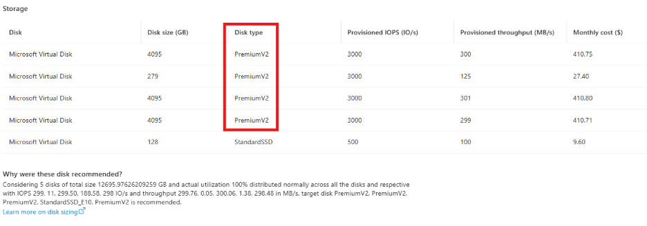 Below is a snippet of how the assessment recommendations appear in Azure Migrate for Premium V2 SSD disks. Customers can get details on the disk type, provisioned IOPS, throughput, cost, and seamlessly migrate using the assessment to the recommended target.