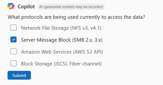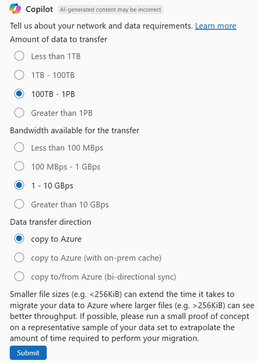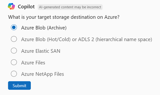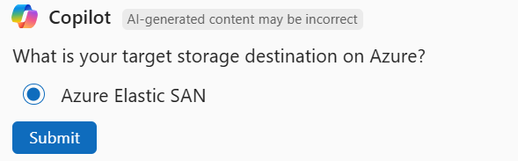 - Provide Details: Copilot will guide you by asking for details about your requirement, such as source type (e.g., NAS, SAN, AWS S3, GCS), protocol (e.g., NFS, SMB, S3 API), target (e.g., Azure Blob, Files, Elastic SAN), data size, and bandwidth.