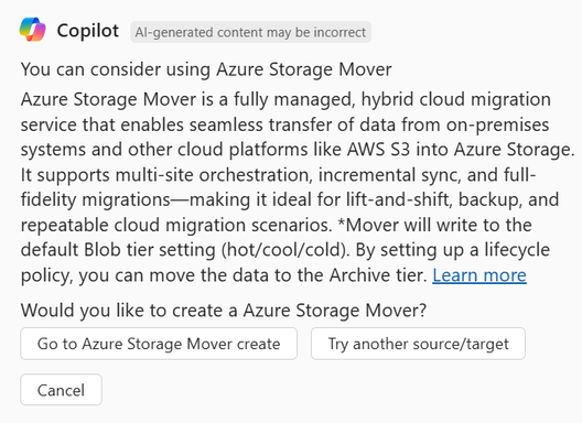 - Combine Copilot’s recommendations with Azure Storage Discovery for visibility into your storage estate after migration.