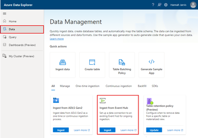To learn more about ingesting preexisting Event Hub events to ADX, read Connect to the event hub, Use the ingestion wizard to create an Azure Event Hubs data connection for Azure Data Explorer, and Data Connections - Create Or Update.
