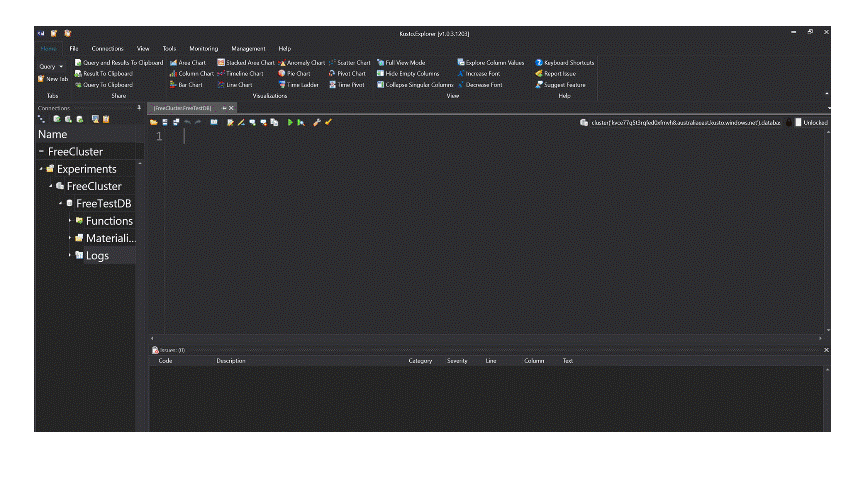 - Kusto Explorer – This windows based desktop application providing all the goodness of ADX web UI but on desktop. You can install the application from - https://aka.ms/ke. The application has easy-to-use user interface and provides advantages like keyboard shortcuts, code refactoring, code analyzer and ready buttons to visualize charts from query results.