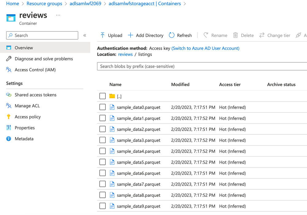 This script uses the Python SDK for Azure Storage to easily upload files to the appropriate blob container or file path. The output should look similar to the screenshot below. Below, the files are stored in a folder path called reviews/listings.