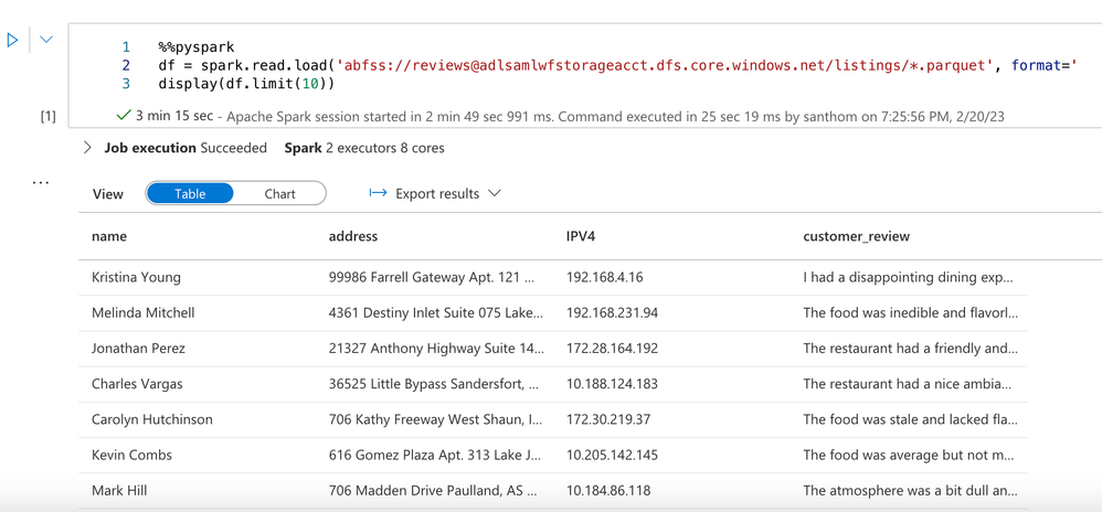 - Finally, save this dataframe in the Delta table format using the code snippet below. Note that this will be saved to a new filepath in the data lake called customer-reviews: