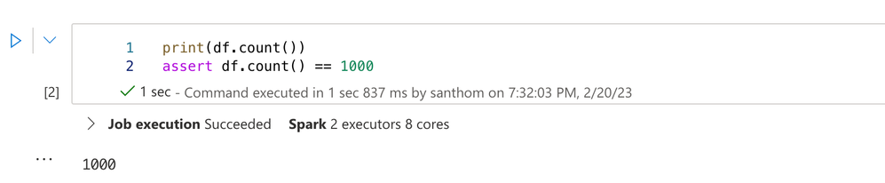 - Then, check the count of rows. Each of the parquet files should have 100 records. In total, 1000 records should have been loaded into the dataframe.