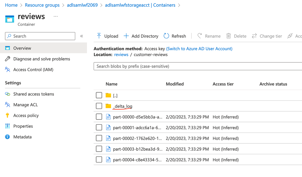 When this step is completed, a new file path called customer-reviews should have the parquet files stored in the new Delta table format as shown below.