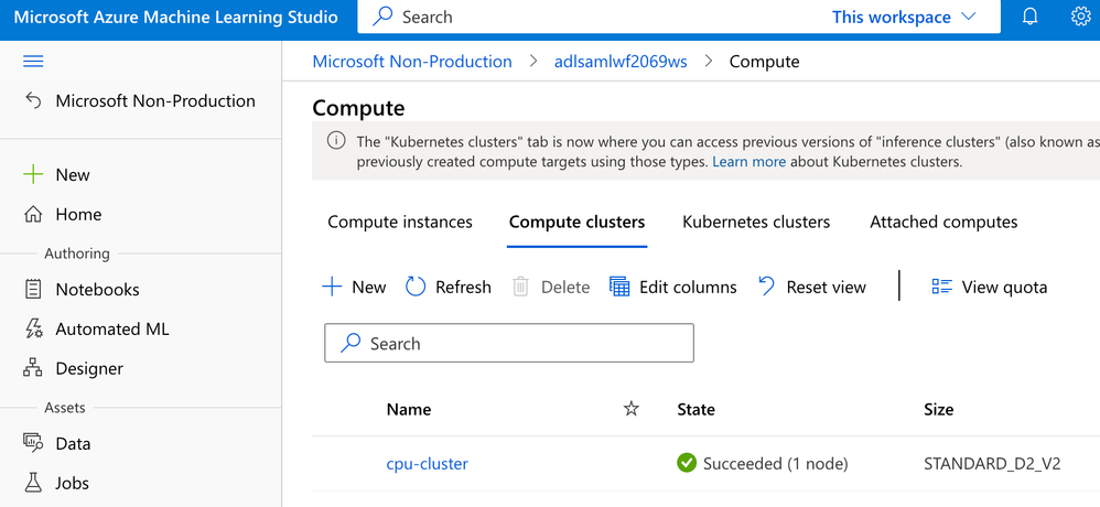 To support the Azure ML pipeline, we need to also create a compute cluster and an environment (Docker + Conda file) to run our code. Pre-created environments exist in Azure ML (making it faster to deploy code) but since we’ll need to add the Cognitive Service for language capability, we’ll build a specific image. To enable this, execute the following command:
