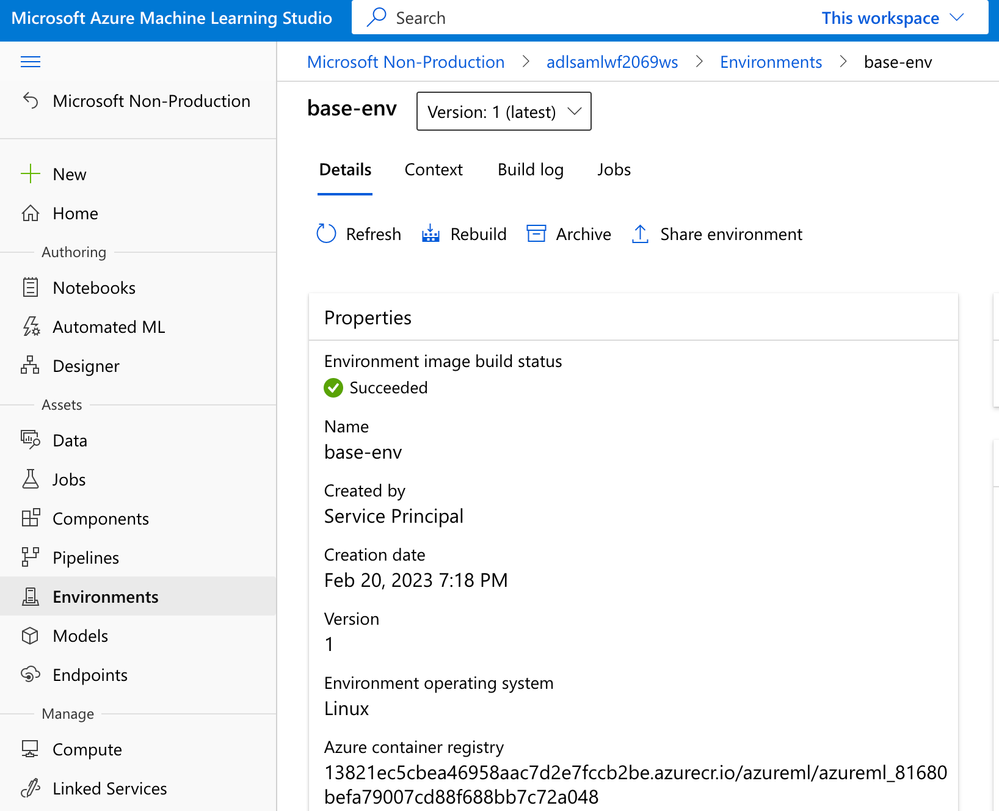 This will build a container image from the environment specifications in the script. The image will be saved in a container registry in the same resource group. When an Azure ML pipeline is triggered, this image will run on the provisioned compute to ensure runtime support for the python scripts. Successful building of the environment would be the following: