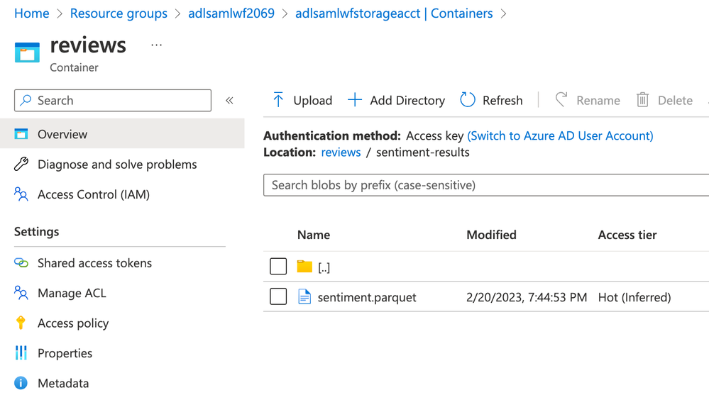 Also, the outputs of the various Azure ML pipeline stages have also been captured in the reviews/sentiment-results file path, and the reviews/clustering-results file path (see screenshots below). The latter is the final dataset to be consumed by downstream processes.