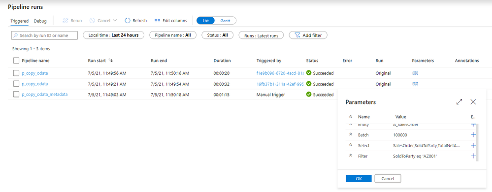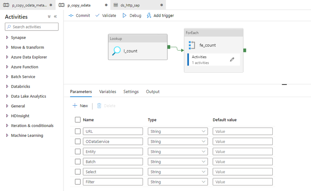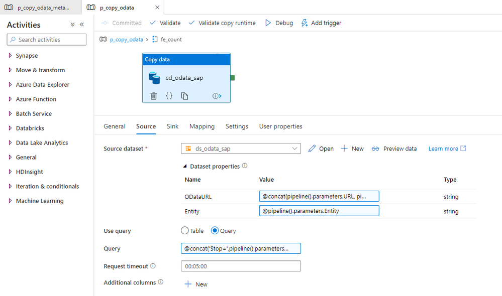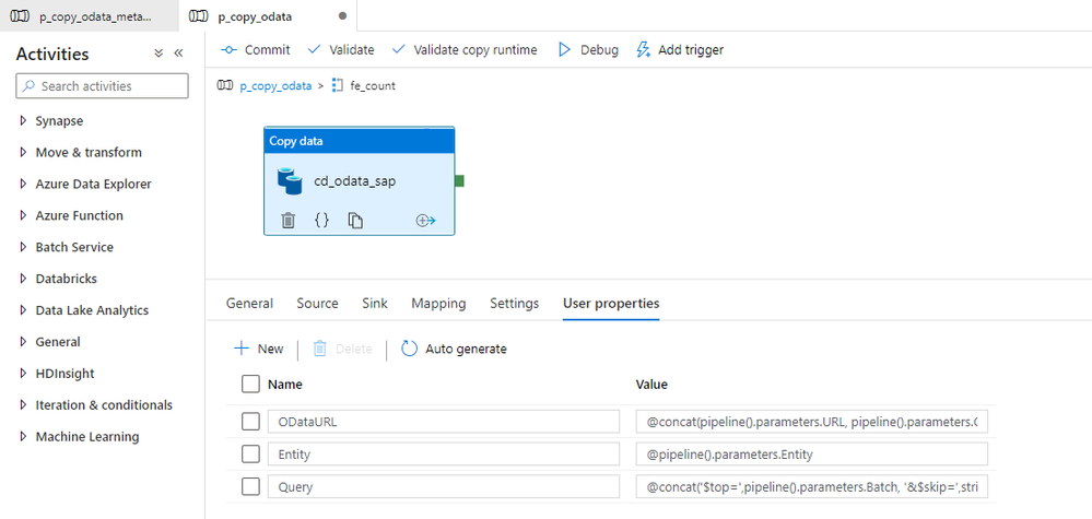 I’m pretty sure that based on the previous episodes of the blog series, you could already implement the logic in the pipeline without my help. But there are two challenges we should be mindful of. Firstly, we should not assume that $filter and $select parameters will always contain a value. If you want to extract the whole entity, you can leave those fields empty, and we should not pass them to the SAP system. In addition, as we are using the client-side caching to chunk the requests into smaller pieces, we need to ensure that we pass the same filtering rules in the Lookup activity where we check the number of records in the OData service.