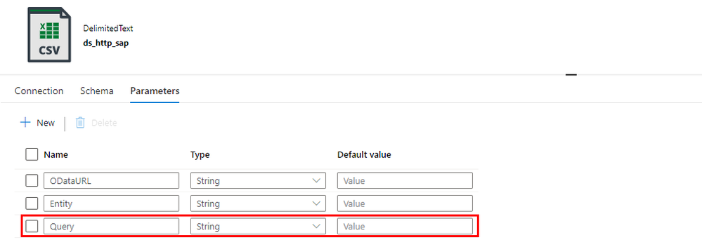 To correctly read the number of records, we have to consider how to combine these additional parameters with the OData URL in the Lookup activity. So far, the dataset accepts two dynamic fields: ODataURL and Entity. To pass the newly defined parameters, you have to add the Query one.