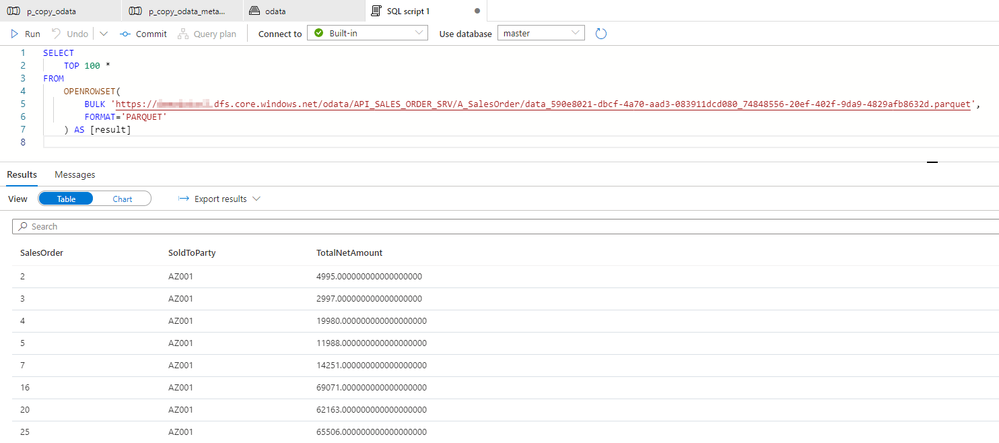The above query will only return records where the field SoldToParty equals AZ001. You can expand it with logical operators ‘and’ and ‘or’ to build complex selection rules. Below I’m using the ‘or’ operator to display data for two Sold-To Parties: