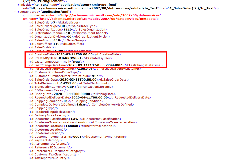 Let’s take the API_SALES_ORDER_SRV as an example, as we worked with that service previously. The entity set A_SalesOrder exposes us Sales Order header information. It contains CreationDate field which holds the timestamp of when was the document initially created as well as the LastChangeDateTime which provides information about last changes. While that’s not always the case for other OData services, the LastChangeDateTime field is updated even if the document was just created and never edited.