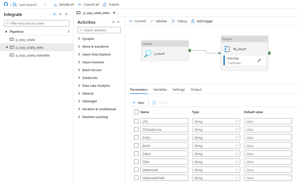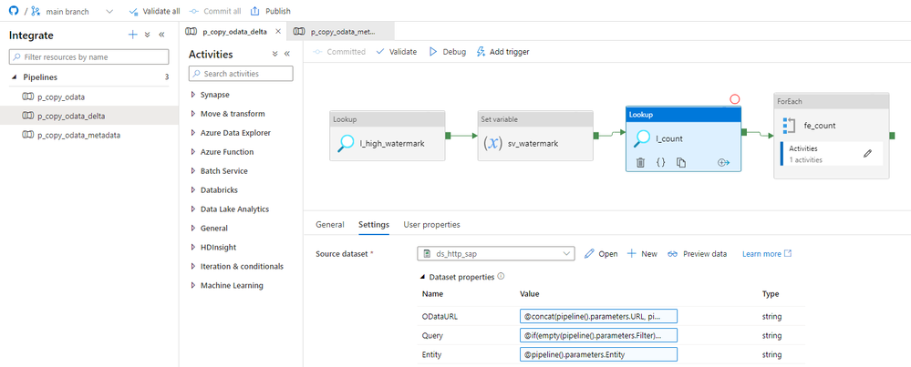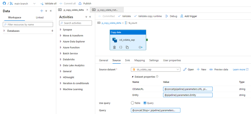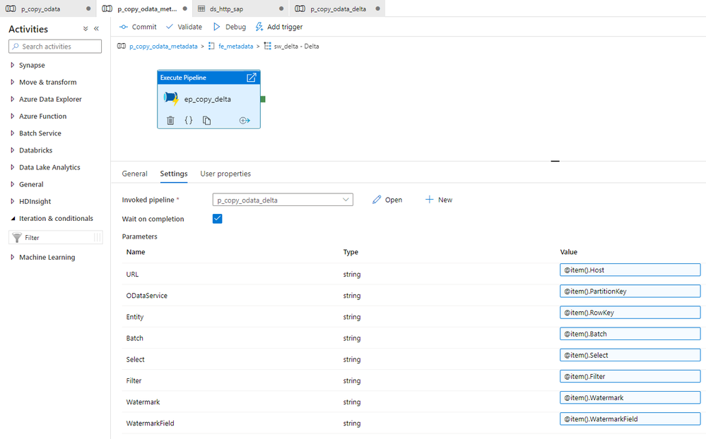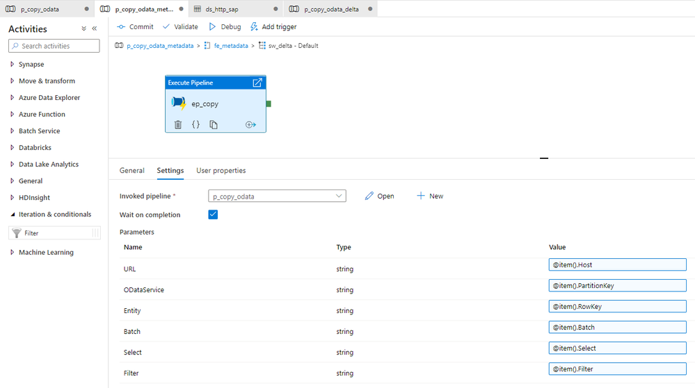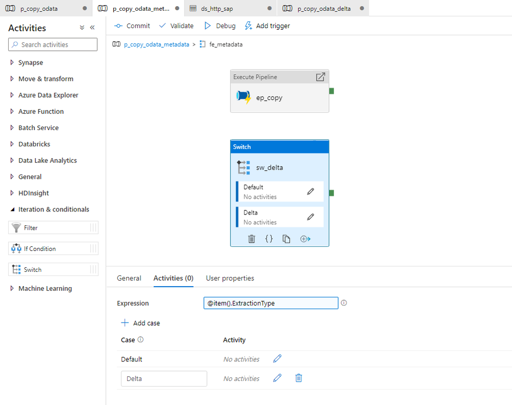 Initially, I considered implementing the above changes to the same child pipeline we’ve used so far, but finally, I decided to create a separate one to increase visibility. All OData services where the delta extraction is not required will still use the old pipeline. I will add a Switch activity in the master pipeline, that based on the value read from the metadata store, will trigger the original or delta-enabled pipeline.