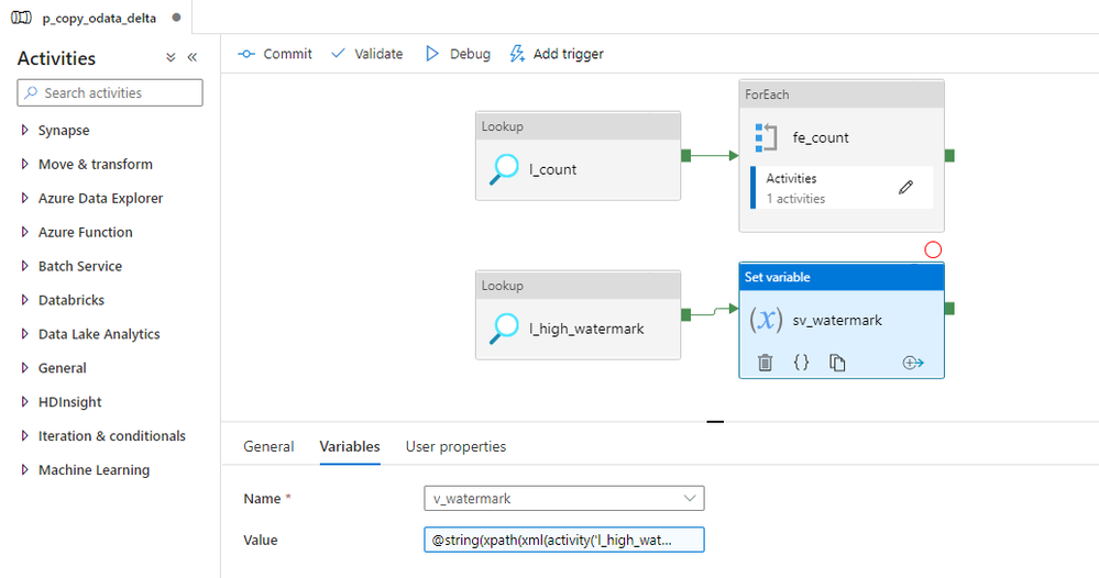 Let’s start with an easy change. Before we check the number of records, we have to read the high watermark figure from the OData service to correctly pass the filtering to all subsequent activities. Add a new Lookup activity and reference the OData dataset. Provide the following expressions: