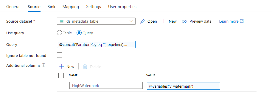As the timestamp field name is not static, but instead we read it from the metadata store, I’m using square brackets to reference it as part of the expressions (that’s quite a cool feature of ADF).