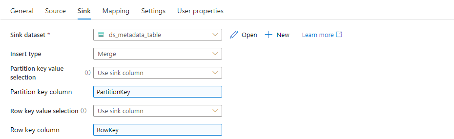 Set the Insert Type to Merge on the Sink tab. That’s important – if you leave it to Replace, the whole entry in the table will be recreated, which means we’ll lose part of the data. Change the fields Partition Key Value Selection and Row Key Value Selection to PartitionKey and RowKey respectively.