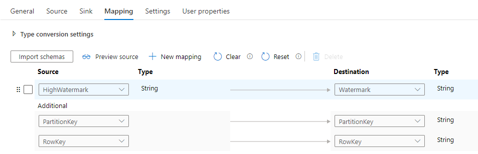 Open the Mapping tab. The goal here is to reference the PartitionKey and RowKey fields to define the record that requires updating and then use the Additional Column HighWatermark to update the destination field Watermark.