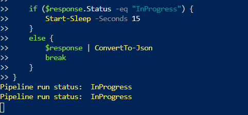 Write-Host "Pipeline run status: " $response.Status -foregroundcolor "Yellow"