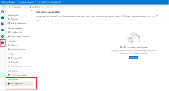 - In your "syn-cicddemo-workspace-dev" Synapse Workspace, navigate to the "Manage Hub" and under "Source Control" select "Git Configuration".