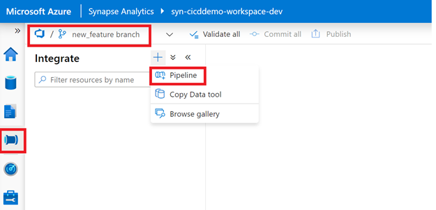- Navigate to the “Integrate” Hub and hit the (+) sign to create a new Pipeline.