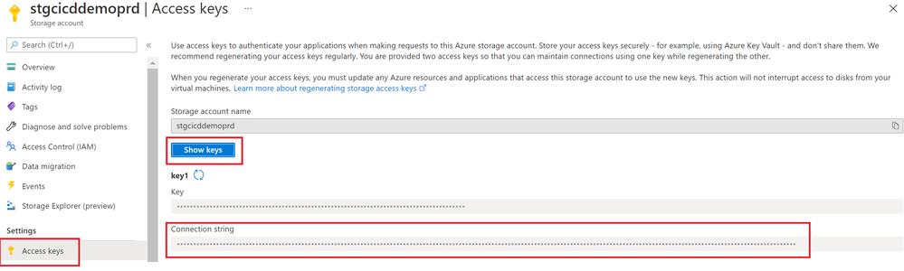 Note:To obtain the connection string, navigate to the storage account resource page and under Settings, select "Access Keys".