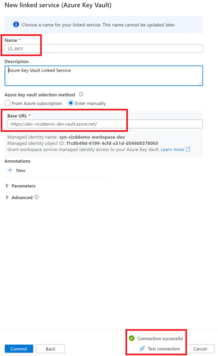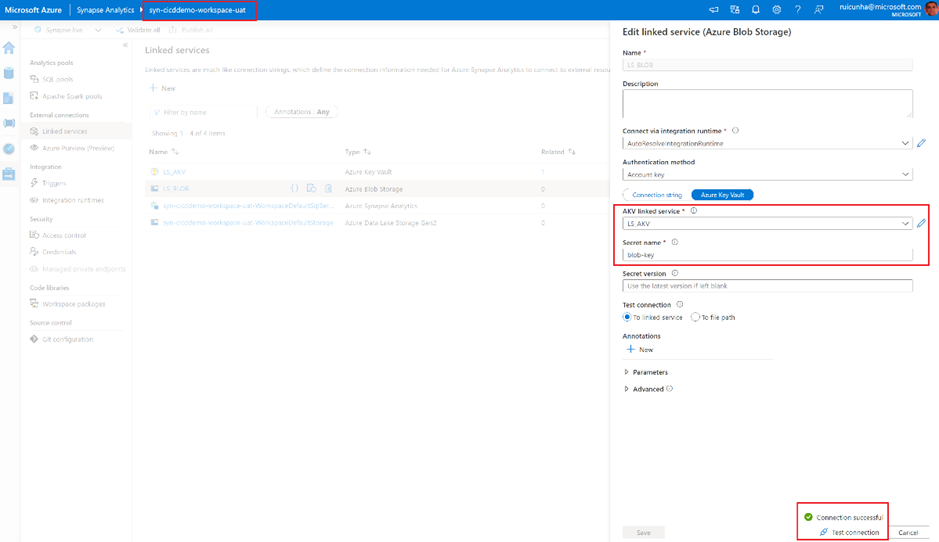 - Now select the "Manage Hub", and confirm the deploy of the newly created Linked Services. Click on the Azure Key Vault Linked Service you will notice that the Base URL is now pointing to the UAT Key Vault address. Test your Linked Service connection to make sure everything is working as expected: you are connecting to the UAT Key Vault.